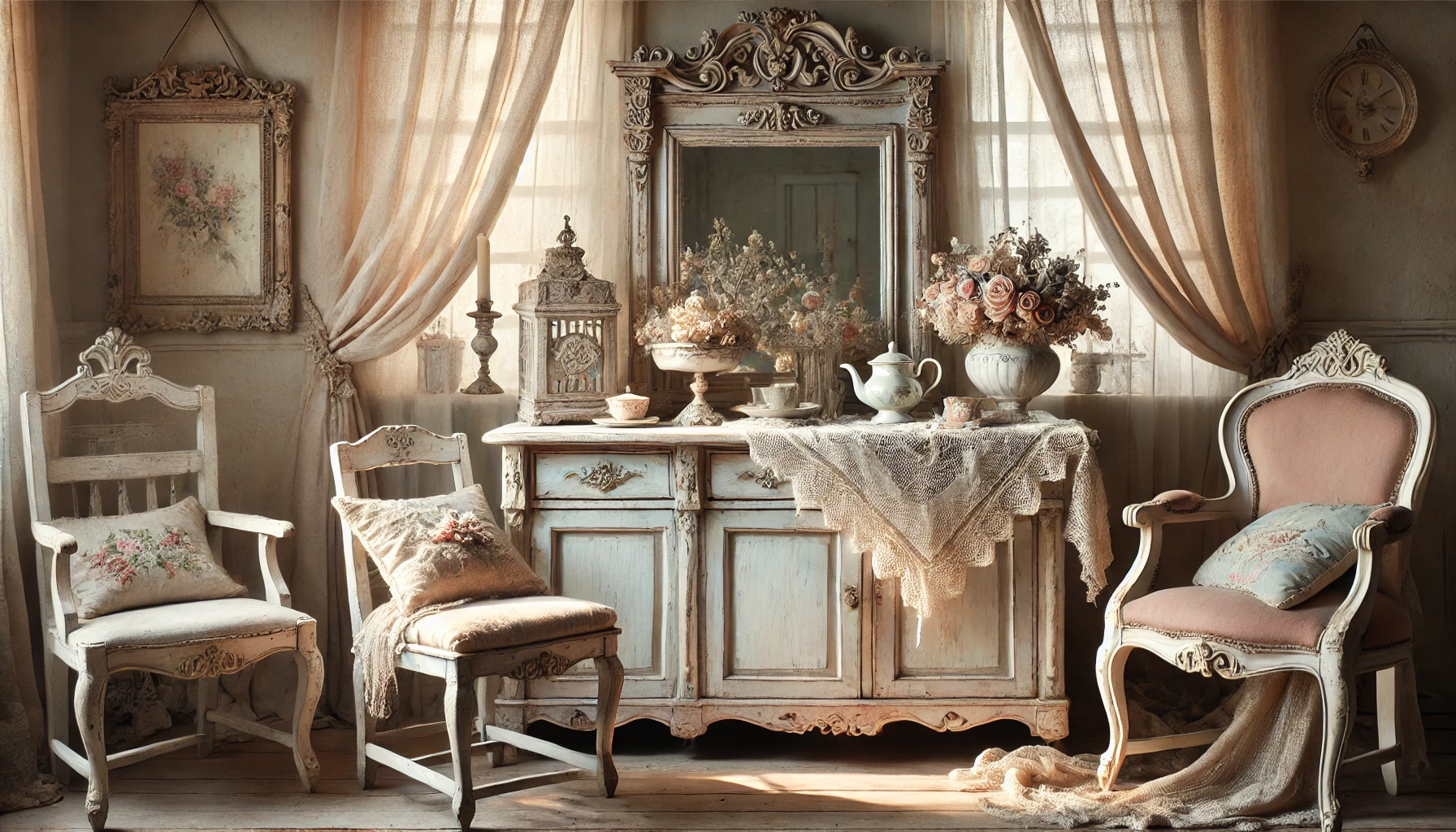 Antiques in shabby chic style are perfect for those who desire inviting, romantic, and character-filled spaces. Restoring antique furniture allows you to breathe new life into pieces with great historical and aesthetic value, creating a warm and timeless atmosphere. With the right touches, you can transform any space into an elegant and refined haven where past and present harmoniously blend.