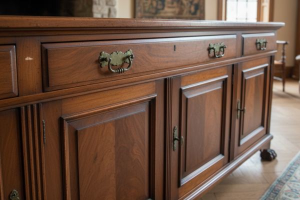 In un soggiorno, una credenza in noce con un piccolo graffio sul bordo.
